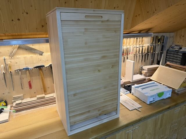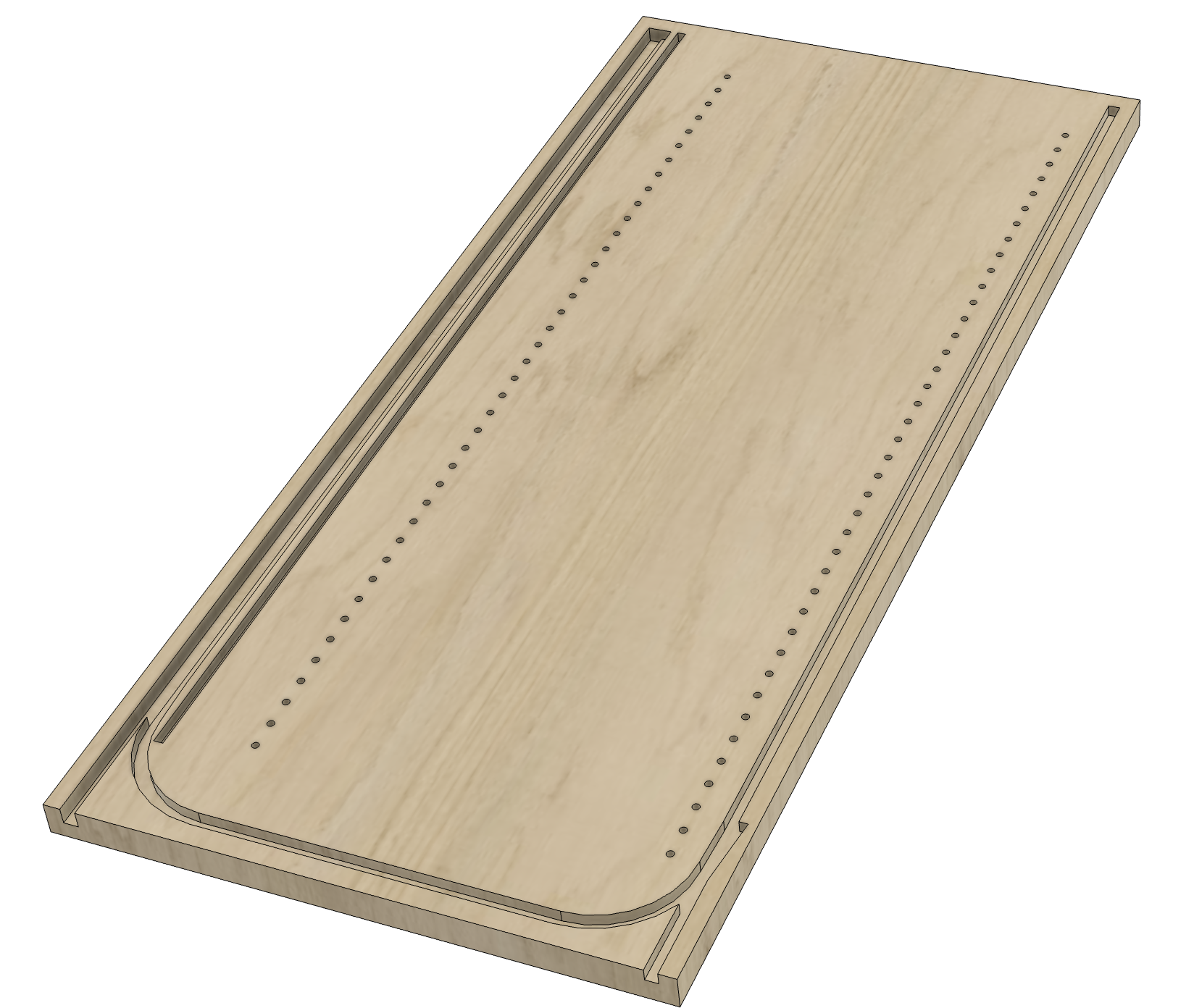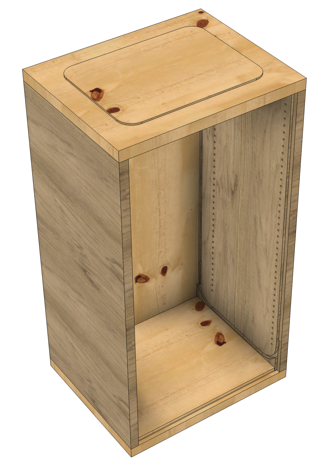Le 13 novembre 2025, dessin définitif du côté droit. La rainure du fond pour le contreplaqué de 10mm, une rainure moins profonde pour la remontée du volet et la rainure pour le miroir du fond. Devant, une rainure pour le volet avec un point d'accroche pour le volet en bas. Les rainures ne sont pas débouchantes en haut parce que la CNC est limitée à 920mm de course !