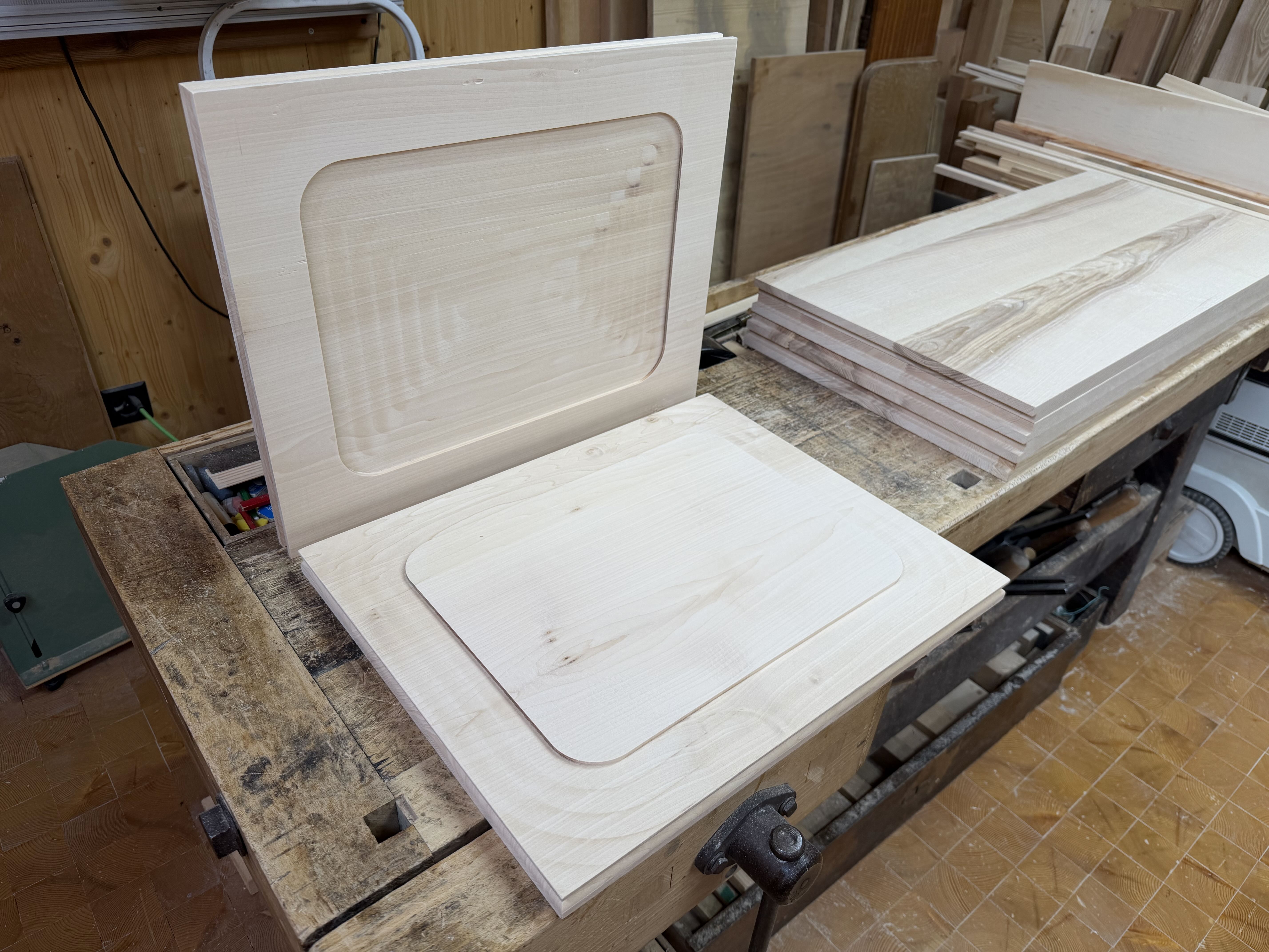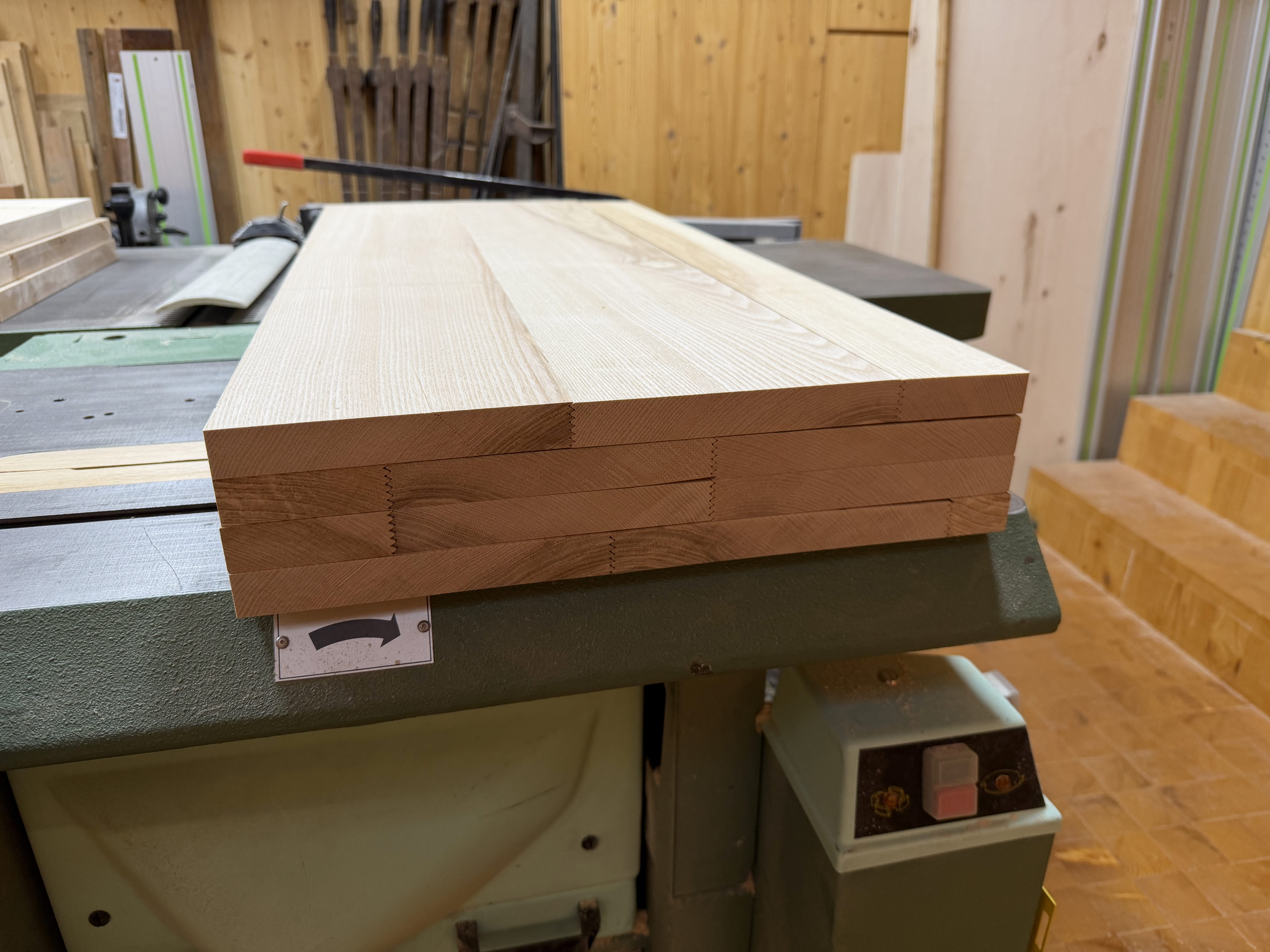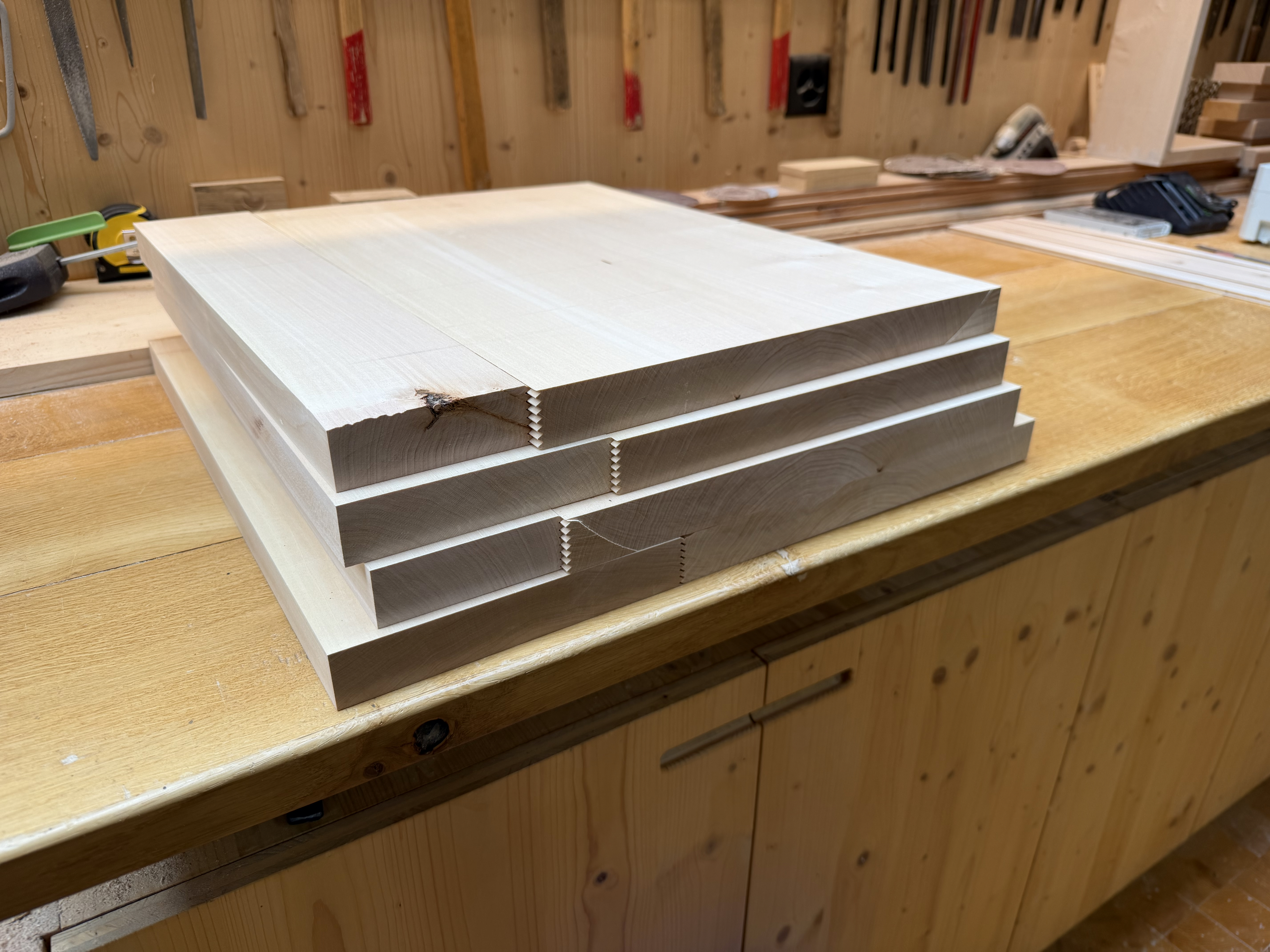Coupe des éléments pour socles et plafonds puis fraisage des stries pour les collages.